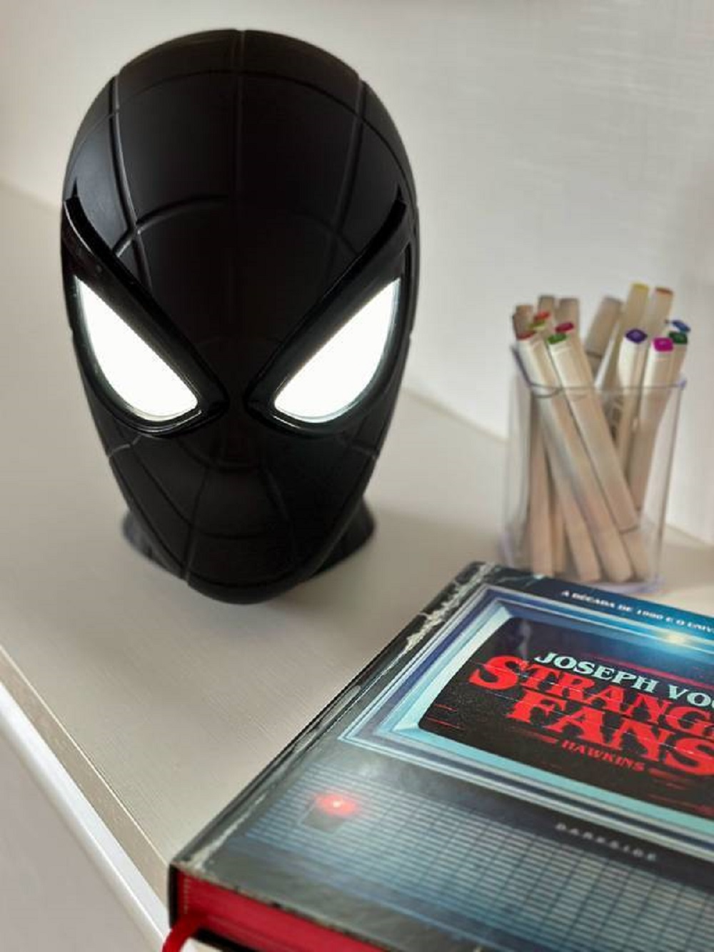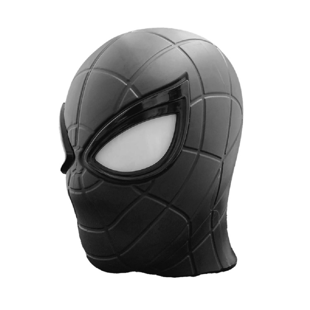 Com um design inspirado no famoso traje do Aranha, a luminária apresenta detalhes vívidos do rosto do personagem, incluindo seus olhos grandes e expressivos, que parecem brilhar com a luz suave que emana de sua base.