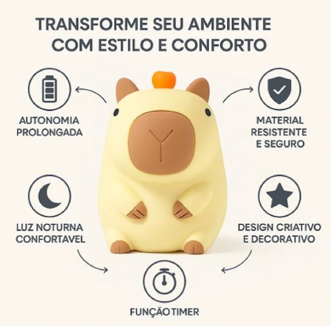 Decore e ilumine seu ambiente com charme e diversão! A luminária capivara é perfeita para quartos, escritórios ou como presente criativo para todas as idades.